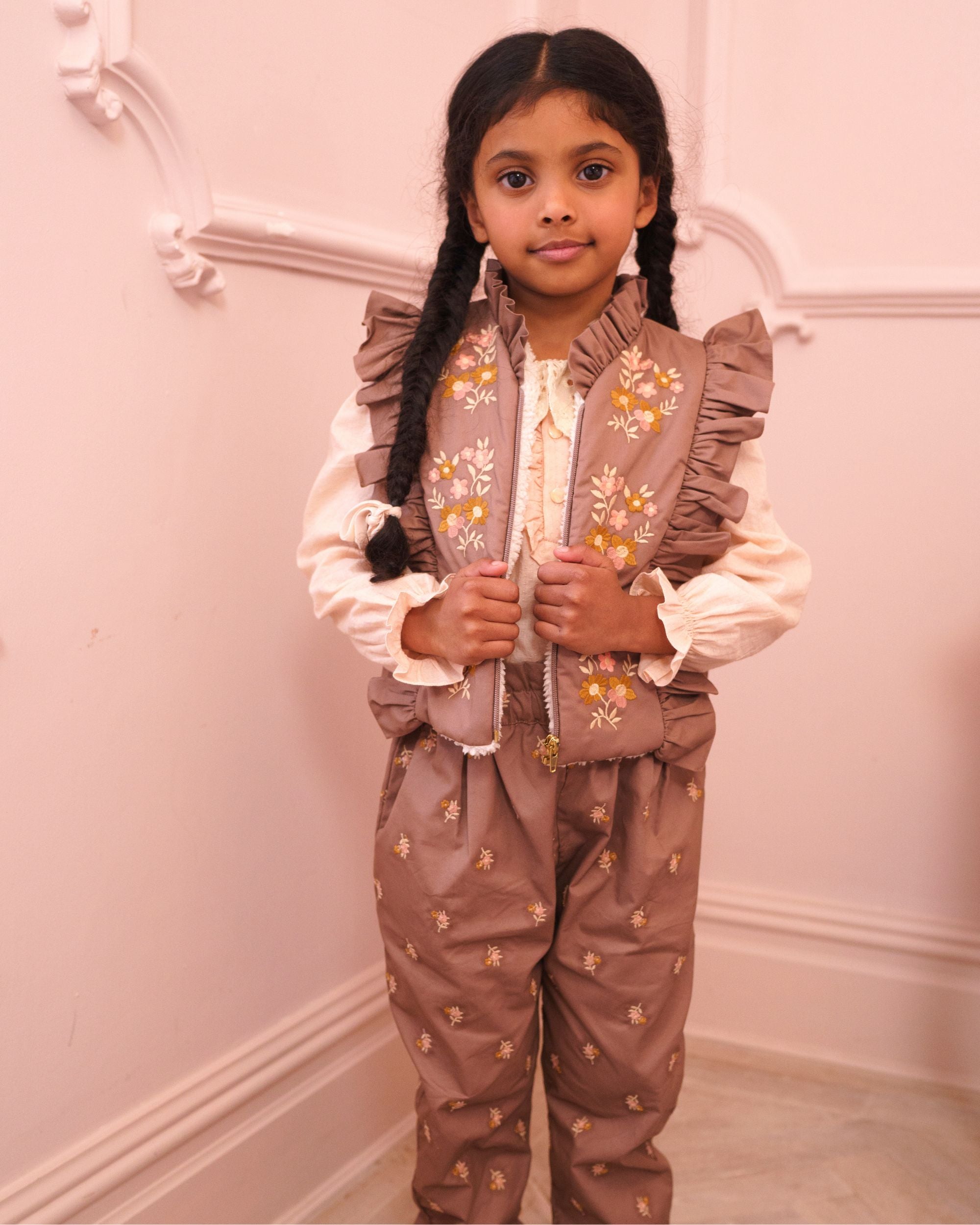 Adrien Trouser will elevate your child’s everyday style in a rich bark shade. Made from soft, brushed 30s cotton twill, these pants feature delicate floral motifs and roomy front pockets. The soft, earthy tone and relaxed fit make them ideal for everything from playtime to quiet evenings at home.