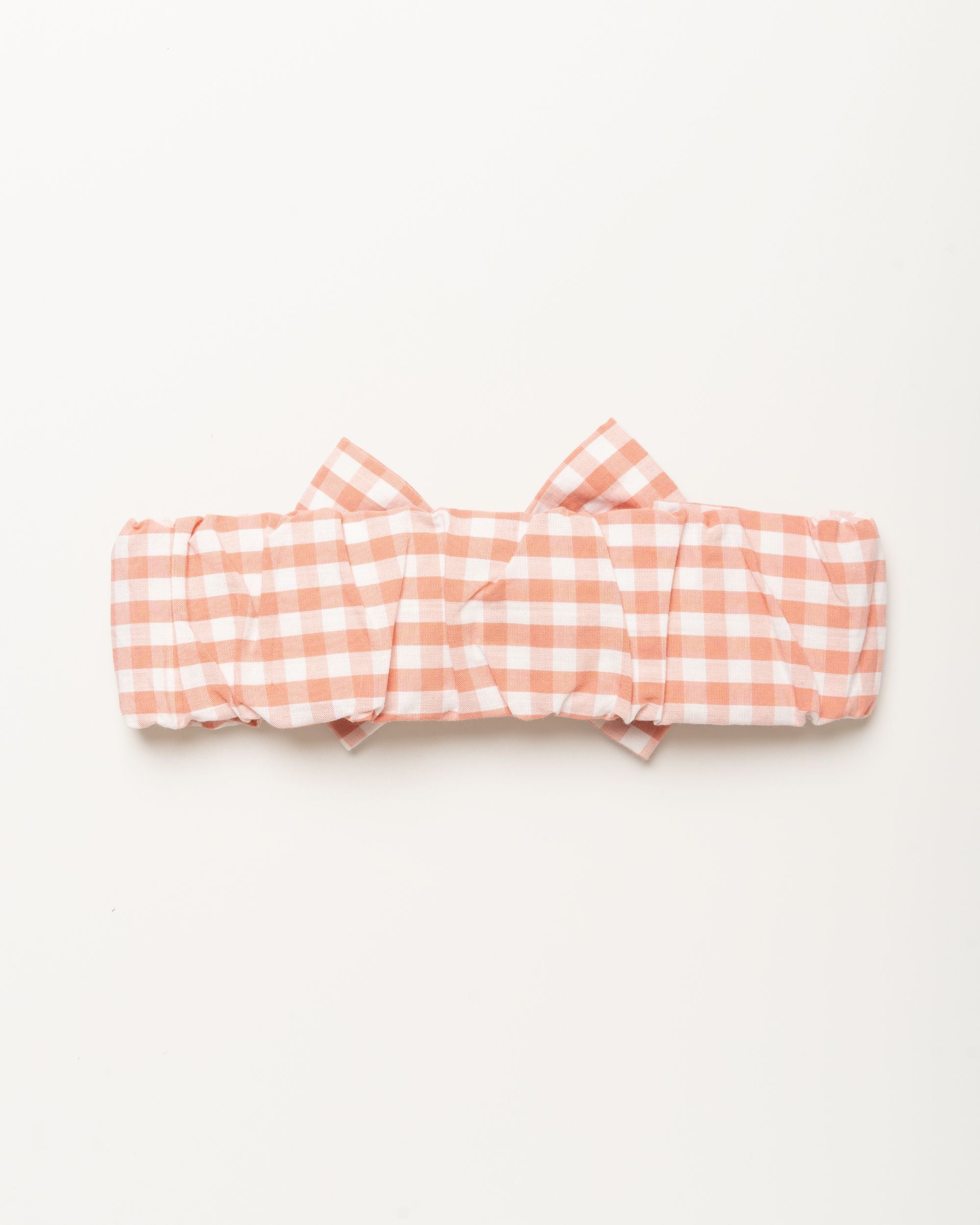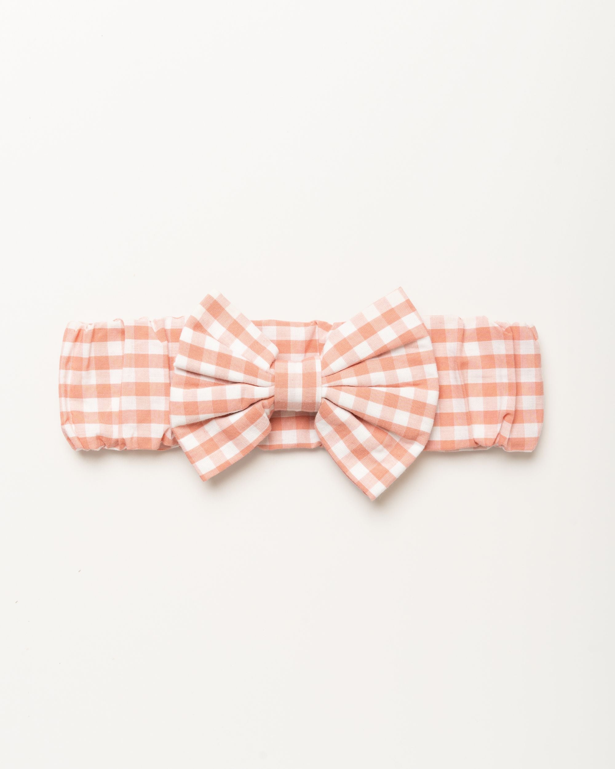 Featuring a classic gingham check in a peony shade, this wide bow headband blends timeless style with everyday comfort. Its soft construction ensures a snug yet gentle fit for little ones.