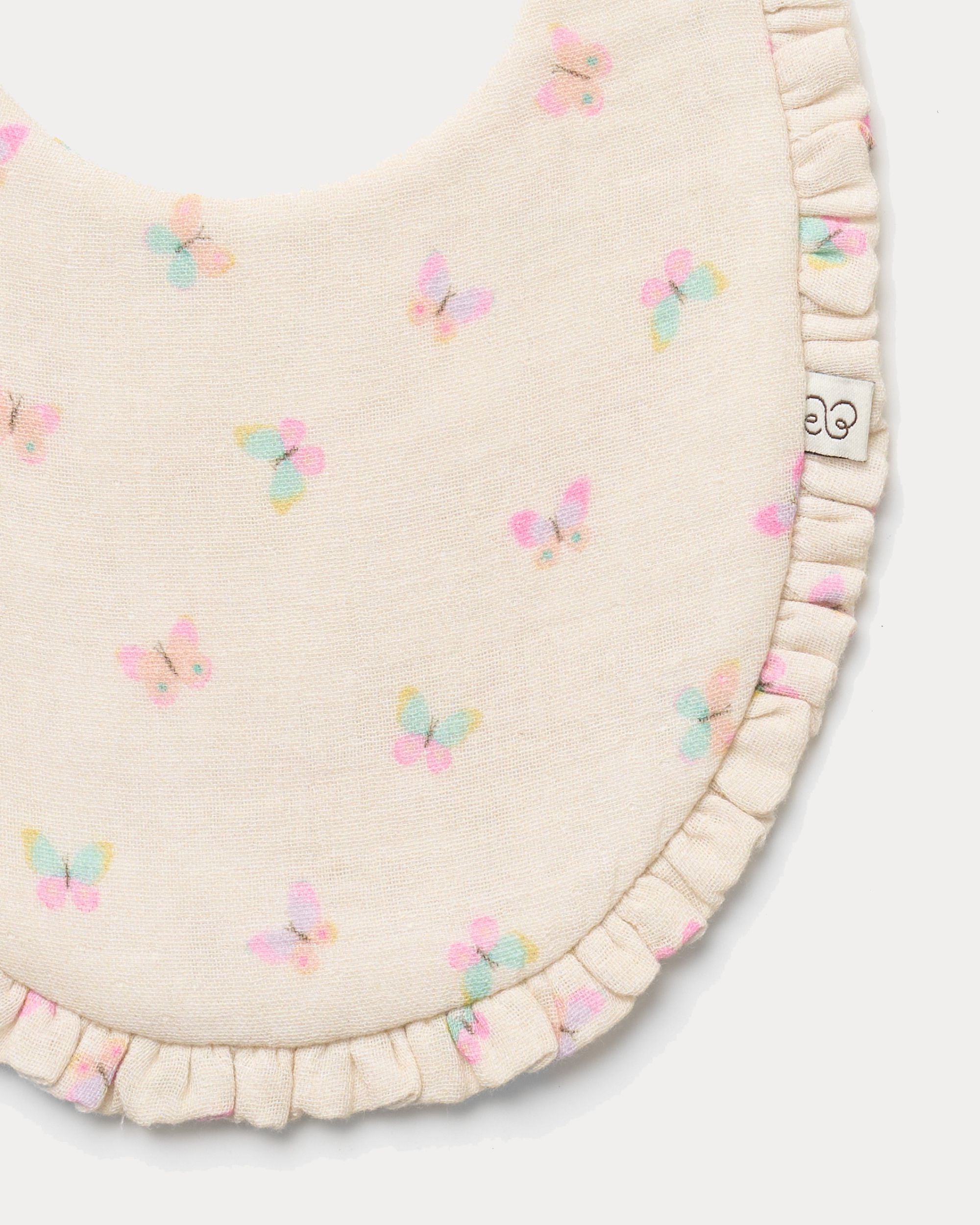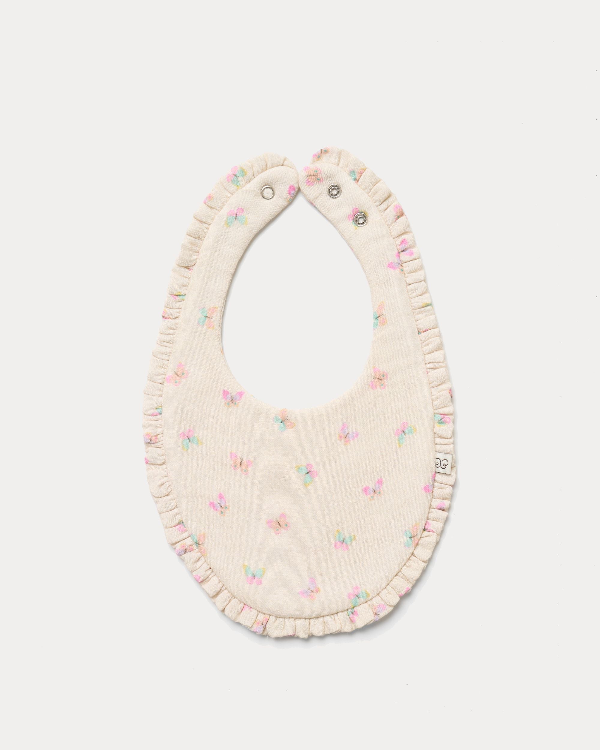This charming bib features a playful butterfly print that adds fun to everyday feeding. Made from printed cotton double gauze, it offers excellent absorbency while remaining soft and breathable. Perfect for keeping babies clean and comfortable.