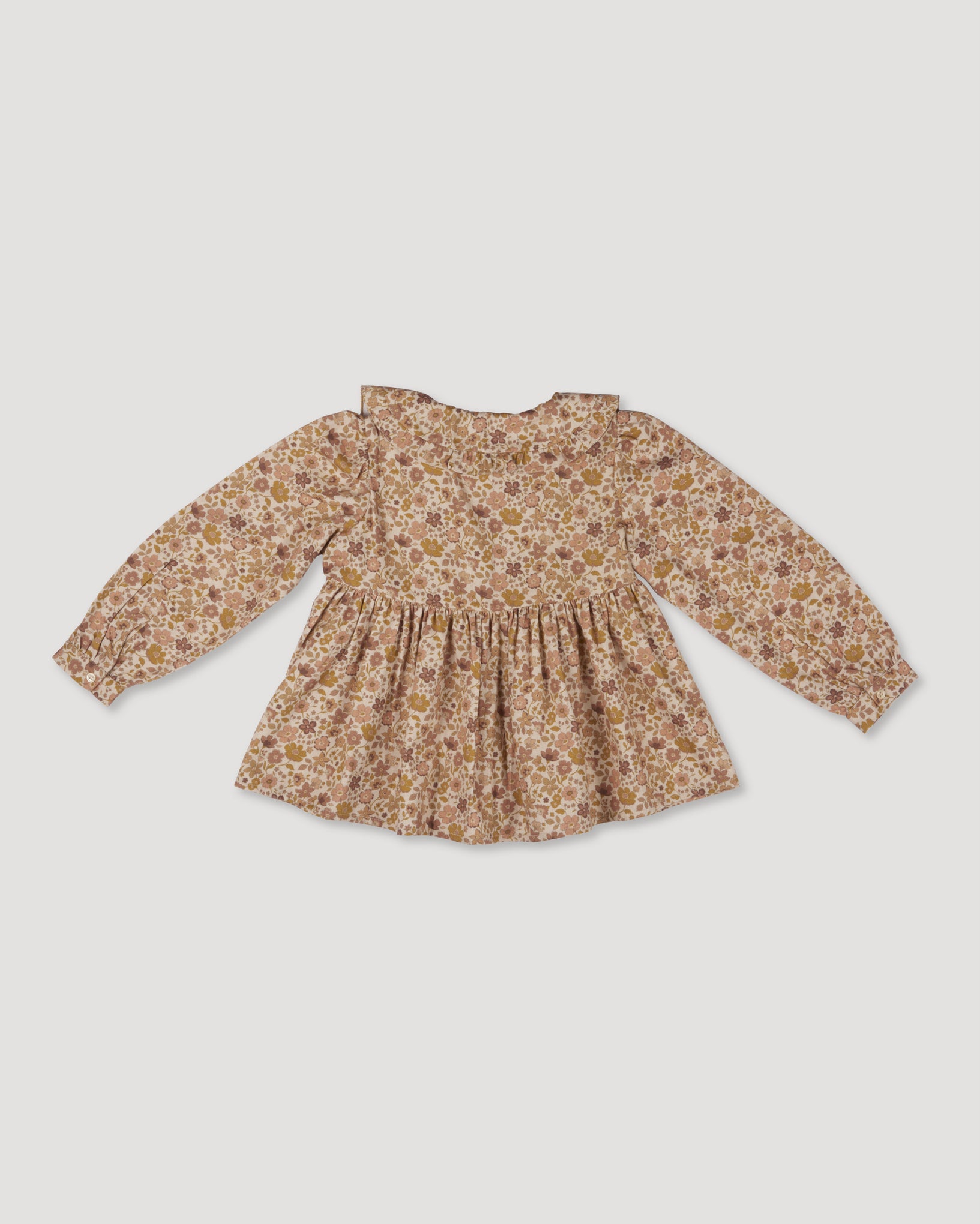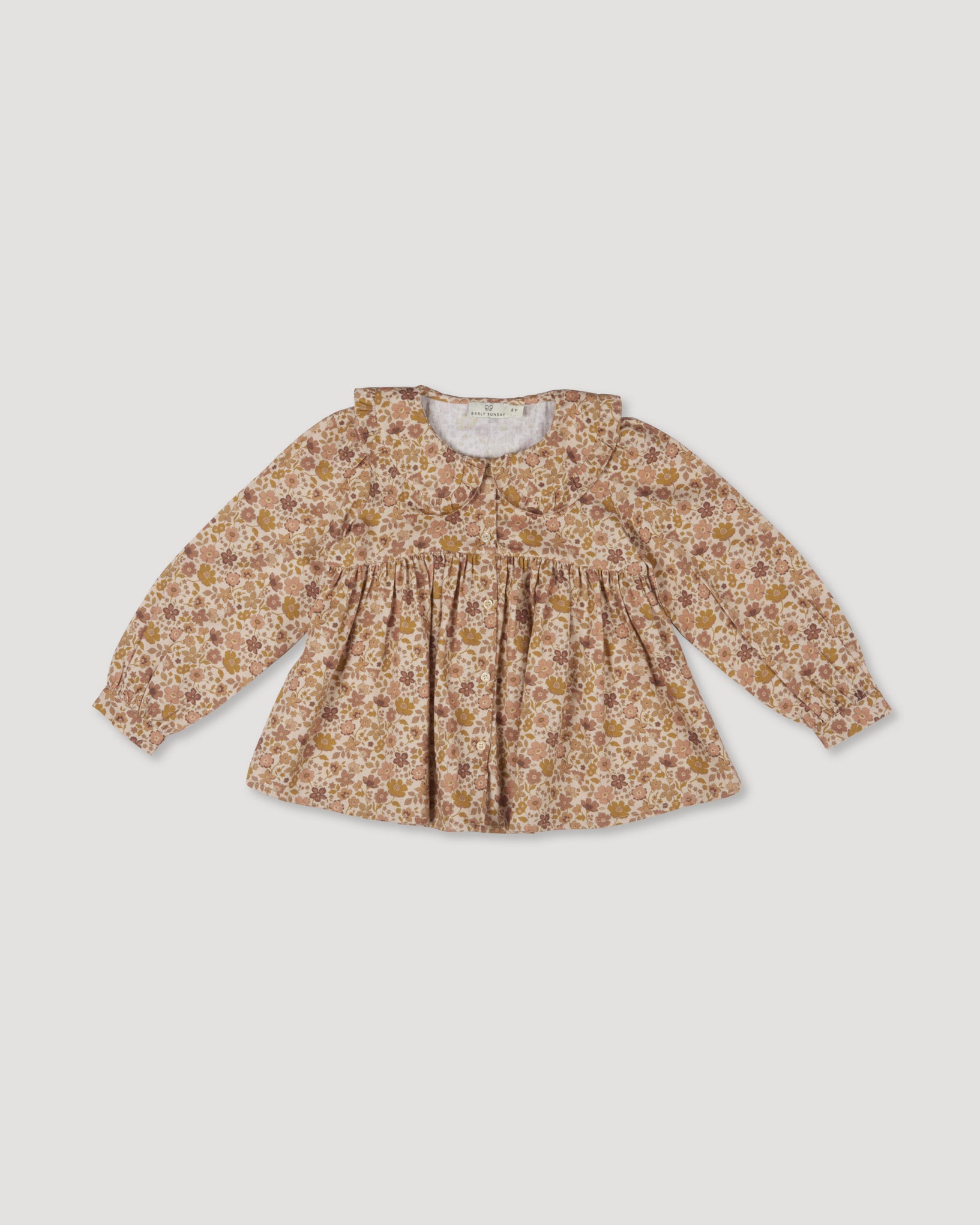 The Colette Blouse, crafted from printed cotton satin, brings a touch of elegance with its garden flowers print in dusty pink. This blouse combines a smooth, lustrous finish with a delicate floral design, perfect for adding a refined touch to any outfit.