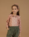 The Ella Blouse, made from soft cotton cambric, features a charming fawn print in a soft pinkish brown shade. With delicate frill detailing on the collar and intricate lace inserts, this blouse offers a blend of elegance and playful design.