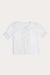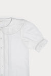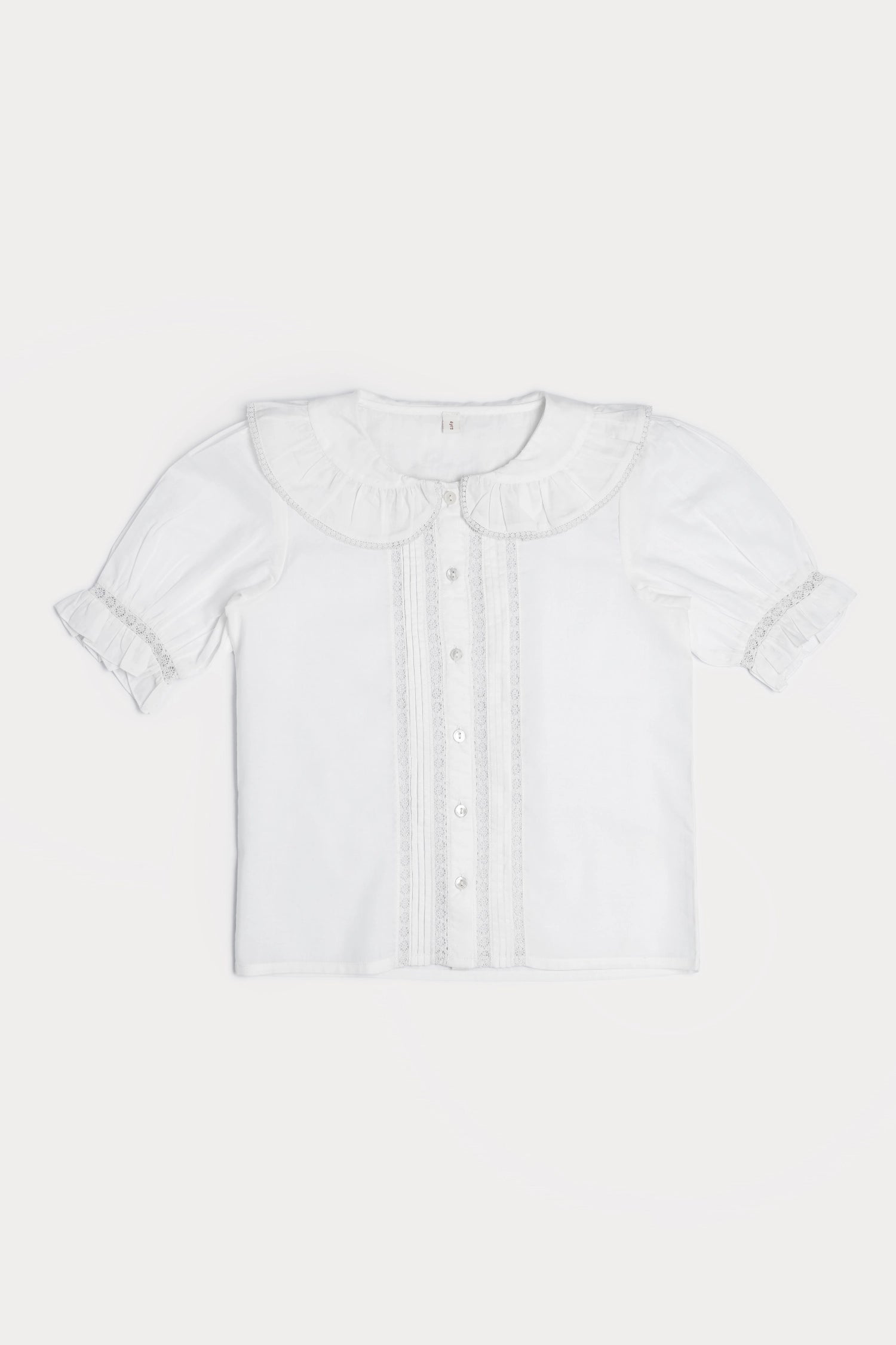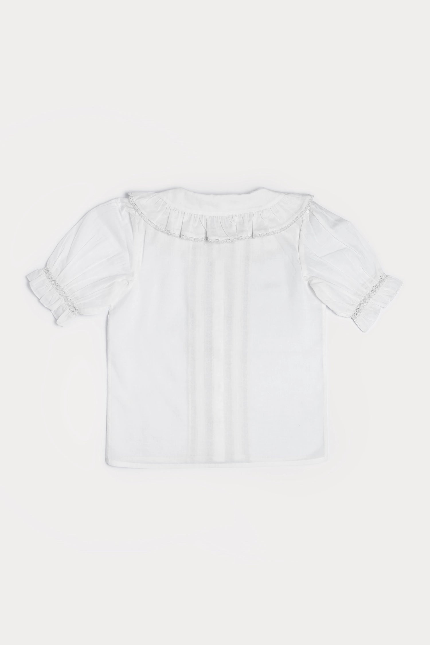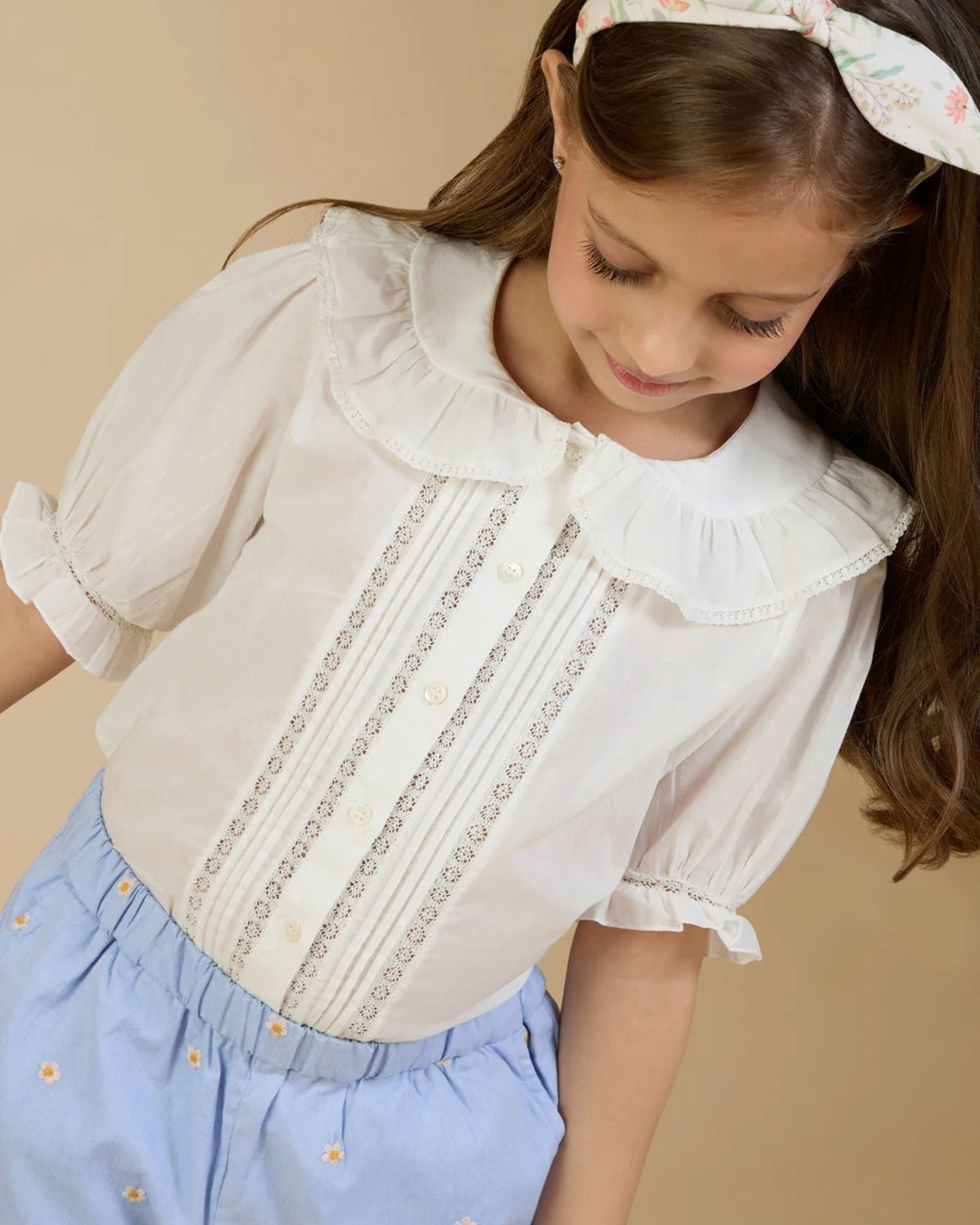 Crafted from airy cotton voile, the Ella Blouse whispers elegance in a luxurious shade of ivory. Balloon sleeves, a charming peter pan collar with lace inserts, and pleat detailing add a touch of timeless sophistication, perfect for little ones with a flair for the dreamy.
