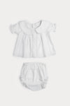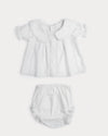 The Elodie Blouse is made from luxurious, soft cotton Swiss dobby, featuring a delicate texture. With a classic peter pan collar and puffed sleeves, this blouse pairs perfectly with matching bloomers, making it ideal for ceremonial occasions.