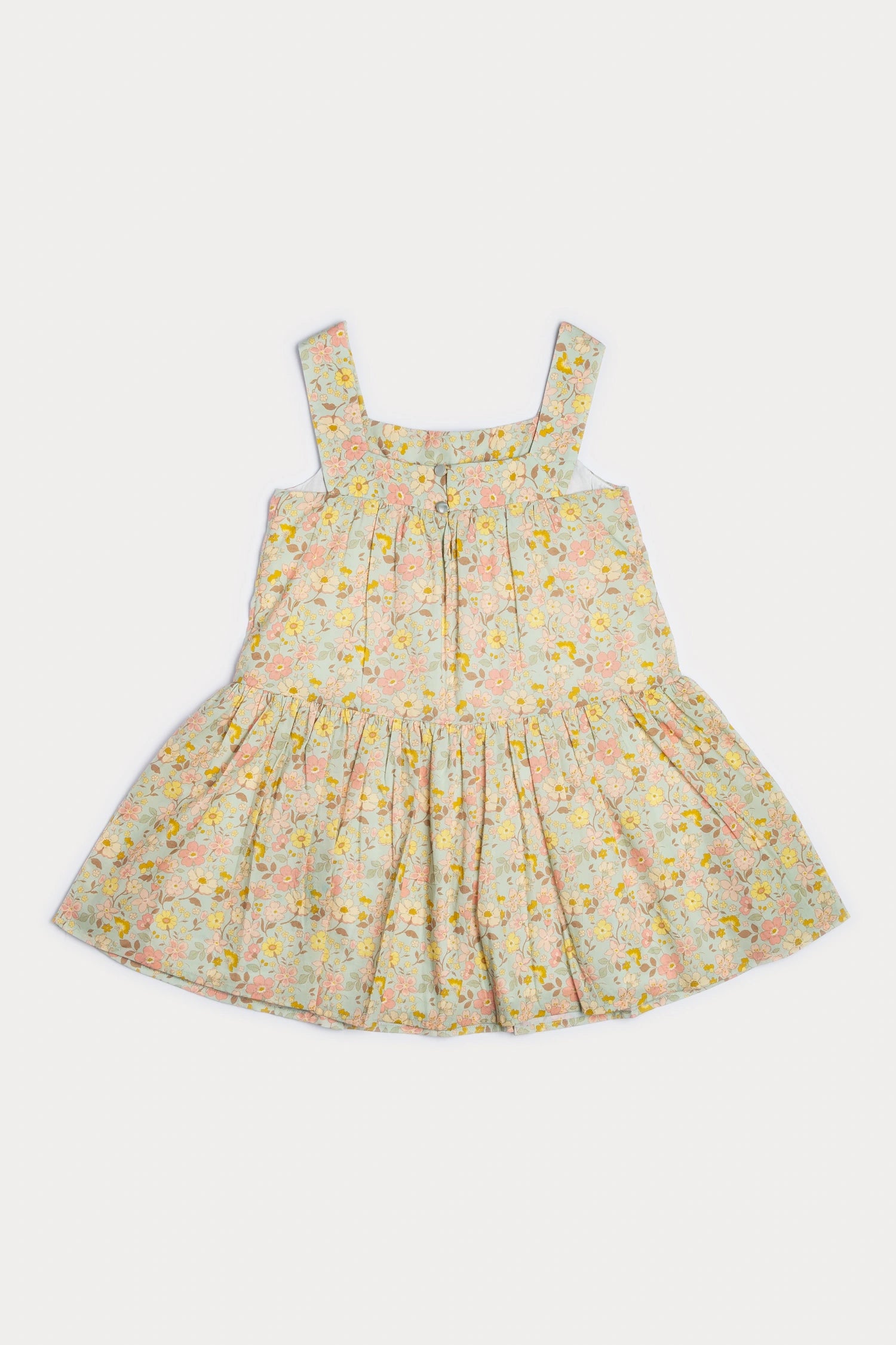 Whimsical garden blooms dance across the Esther Dress, crafted from soft cotton cambric. With a sleeveless design and a square neckline, this dress offers comfort for all-day adventures. The multicolored garden flower print catches the eye and adds a touch of playful charm.