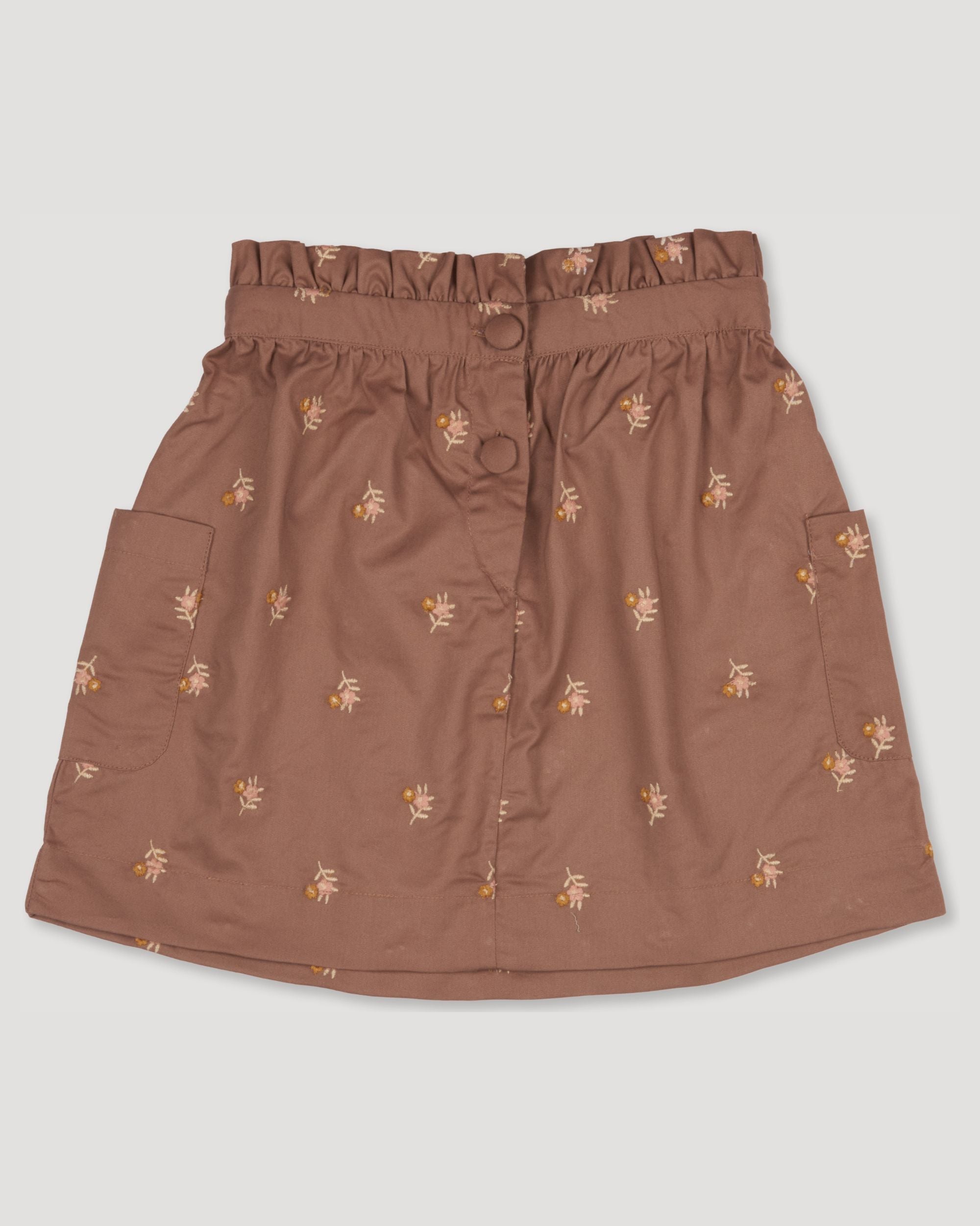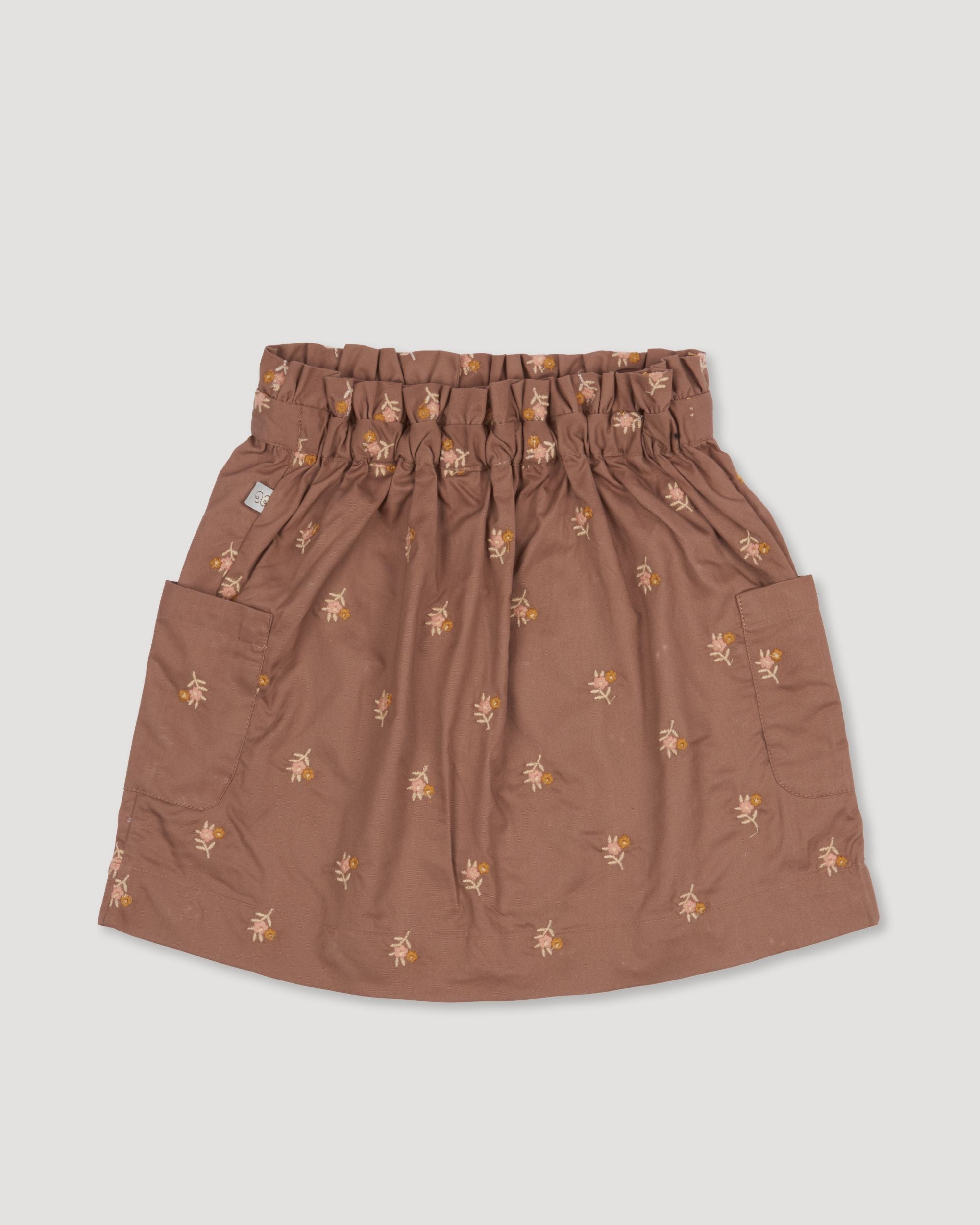 Classic texture meets understated elegance in the Hilda Skirt, crafted in an all-over embroidered 30s cotton brushed twill in a warm bark hue. This skirt combines earthy tones with delicate detailing, making it a versatile piece for refined everyday wear.