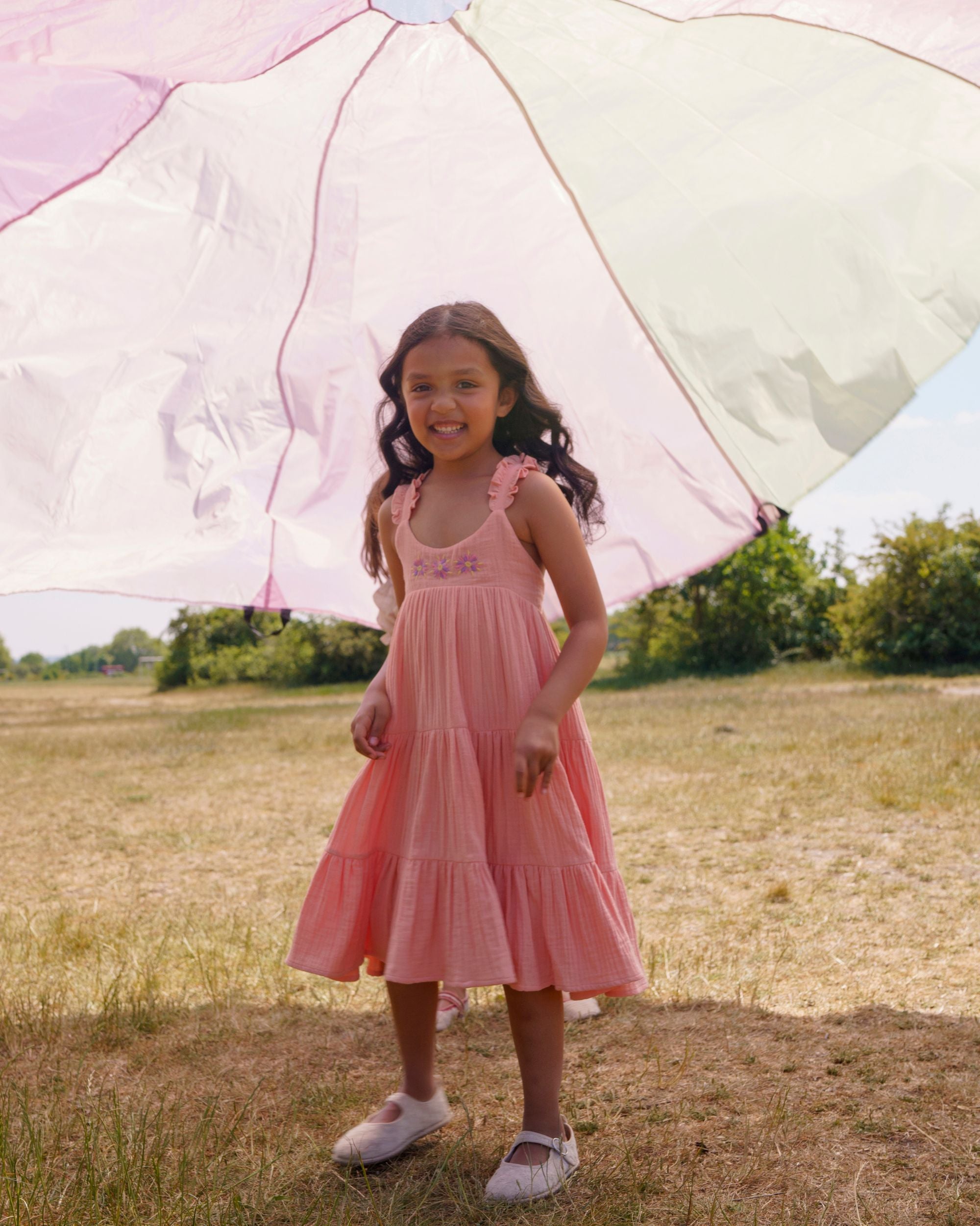 Laura Dress, a soft and dreamy piece crafted in 100% Cotton Double Gauze in a sweet Candy Floss shade. Designed for pure comfort and charming simplicity, this dress features an airy lightweight feel, gentle gathers, and a beautifully flowing silhouette, with a cross back style.