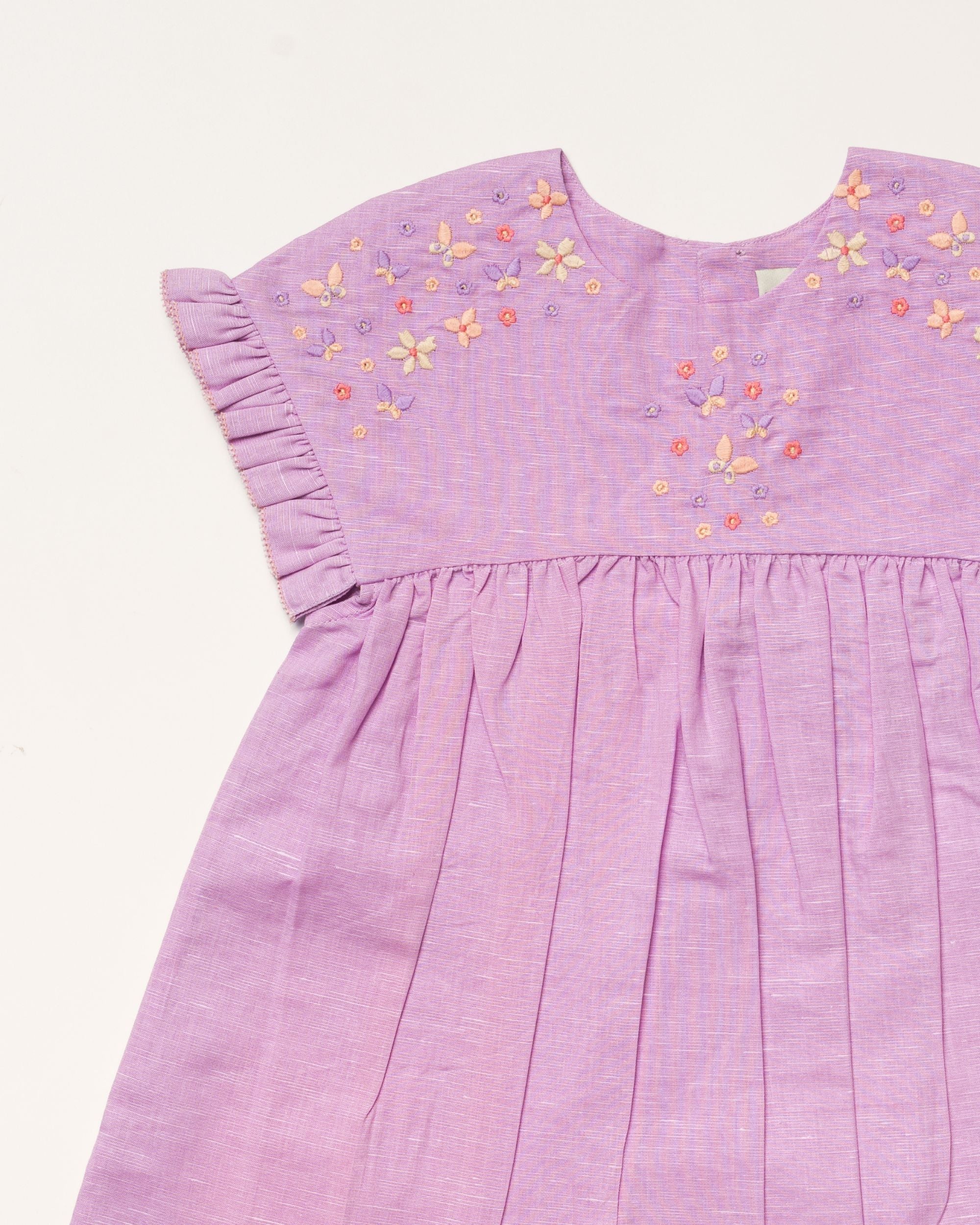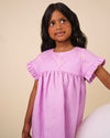 Lila Dress, a beautifully graceful and charming piece crafted in 70% Cotton 30% Linen Solid Dyed Fabric in a lovely Lilac shade. With its smooth, soft texture, gentle gathers, flutter sleeves, and sweet silhouette, this dress blends comfort with timeless elegance, perfect for little moments filled with joy and style.