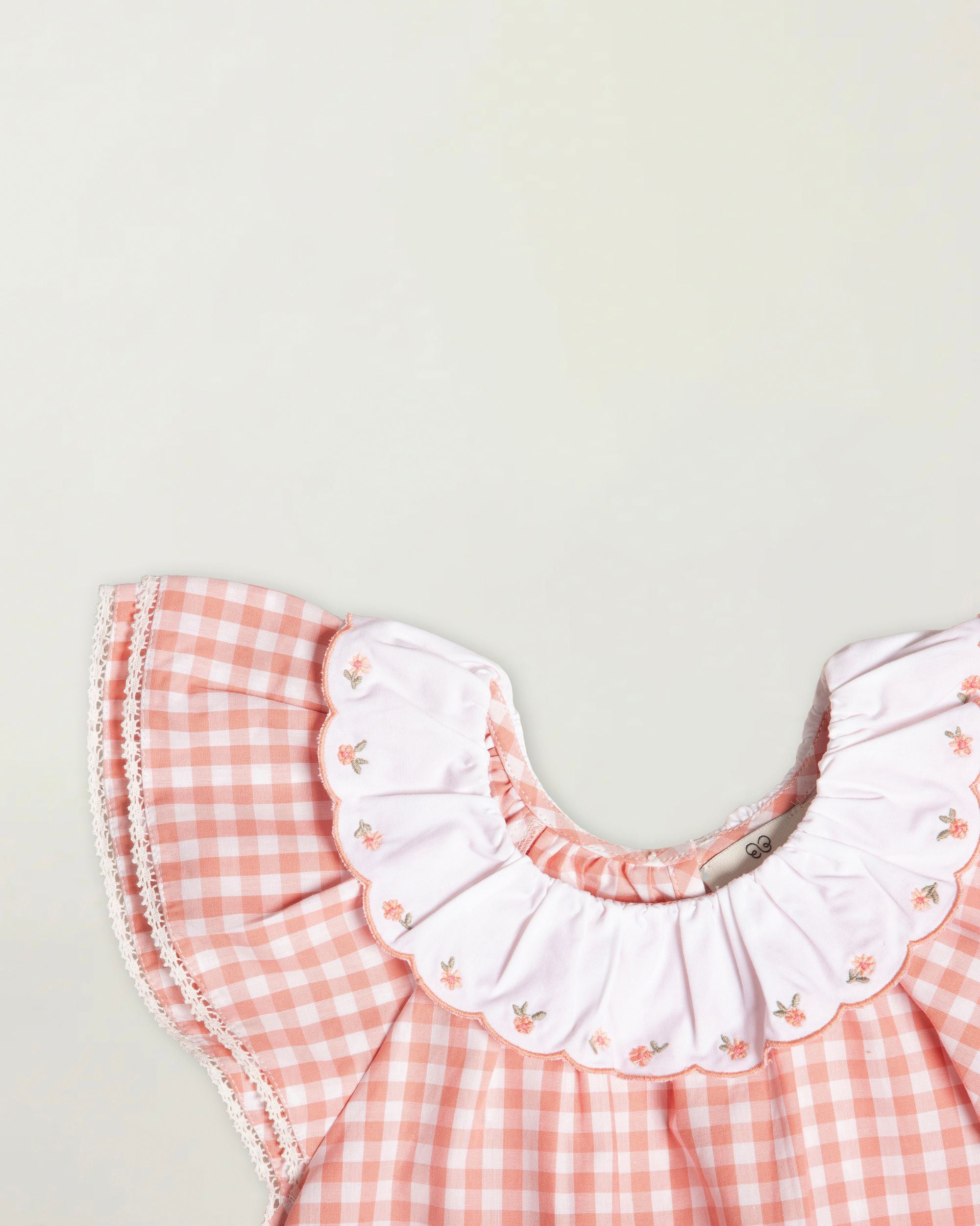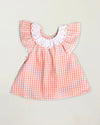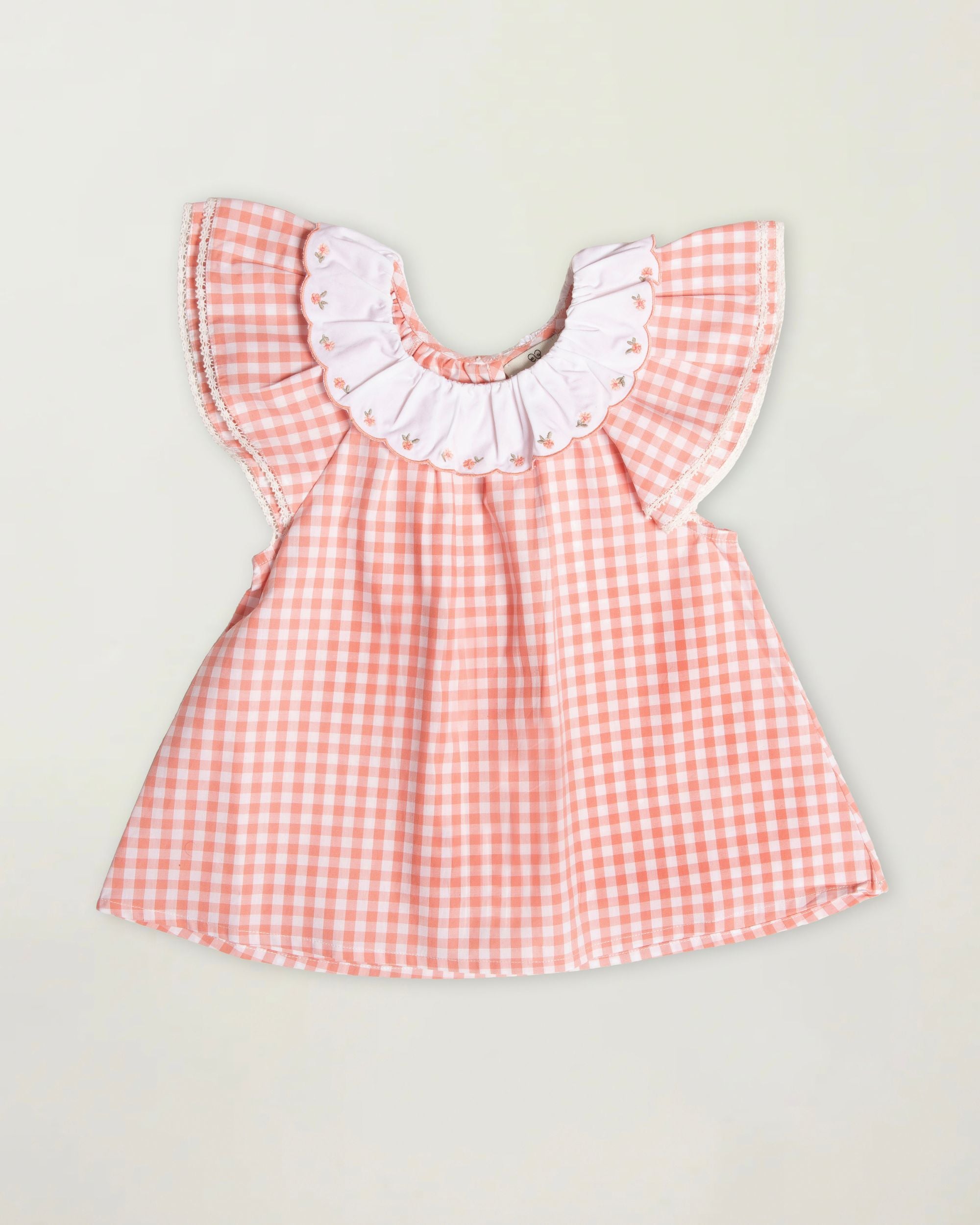 Design: Traditional gingham checks, ruffled neckline, flutter sleeves, and delicate gathers for a graceful silhouette