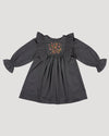 Style: Classic silhouette with floral embroidery around the yoke, ruffle detailing