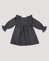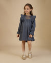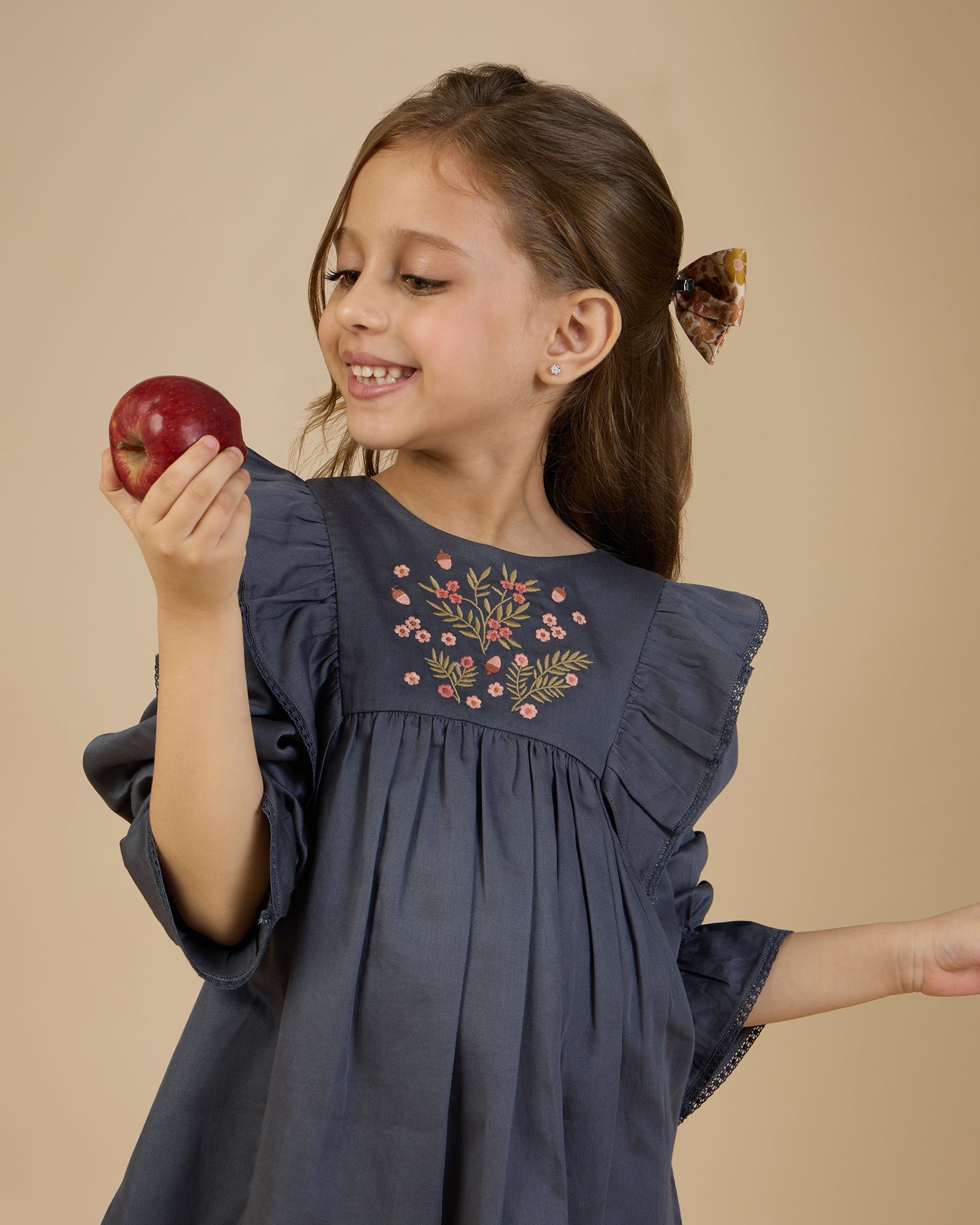 The Margot Dress, crafted from luxurious cotton satin, features intricate floral embroidery around the yoke and charming ruffle detailing. In a sophisticated stormy blue shade, this dress offers a refined blend of elegance and comfort, perfect for any special occasion or everyday wear.