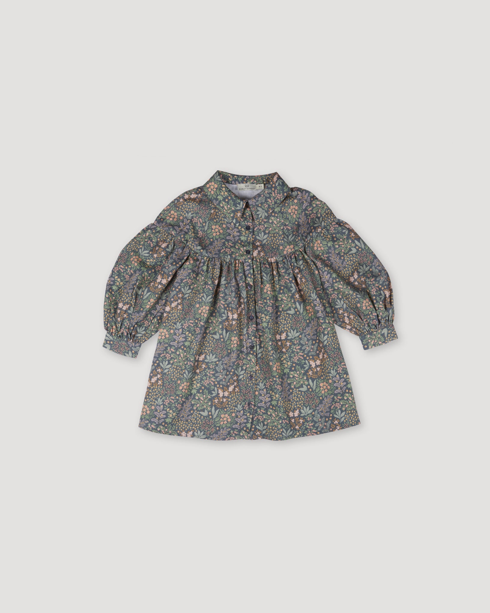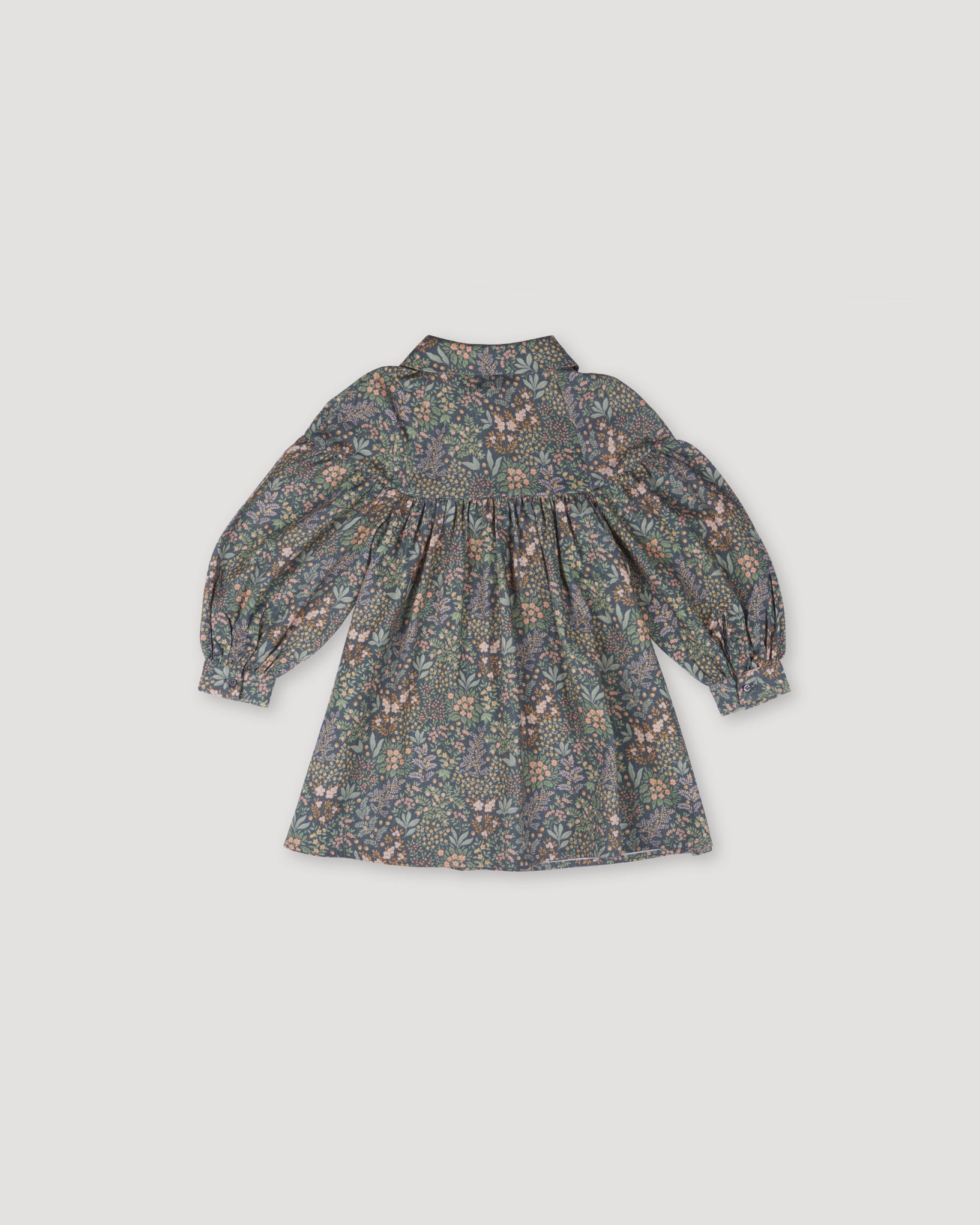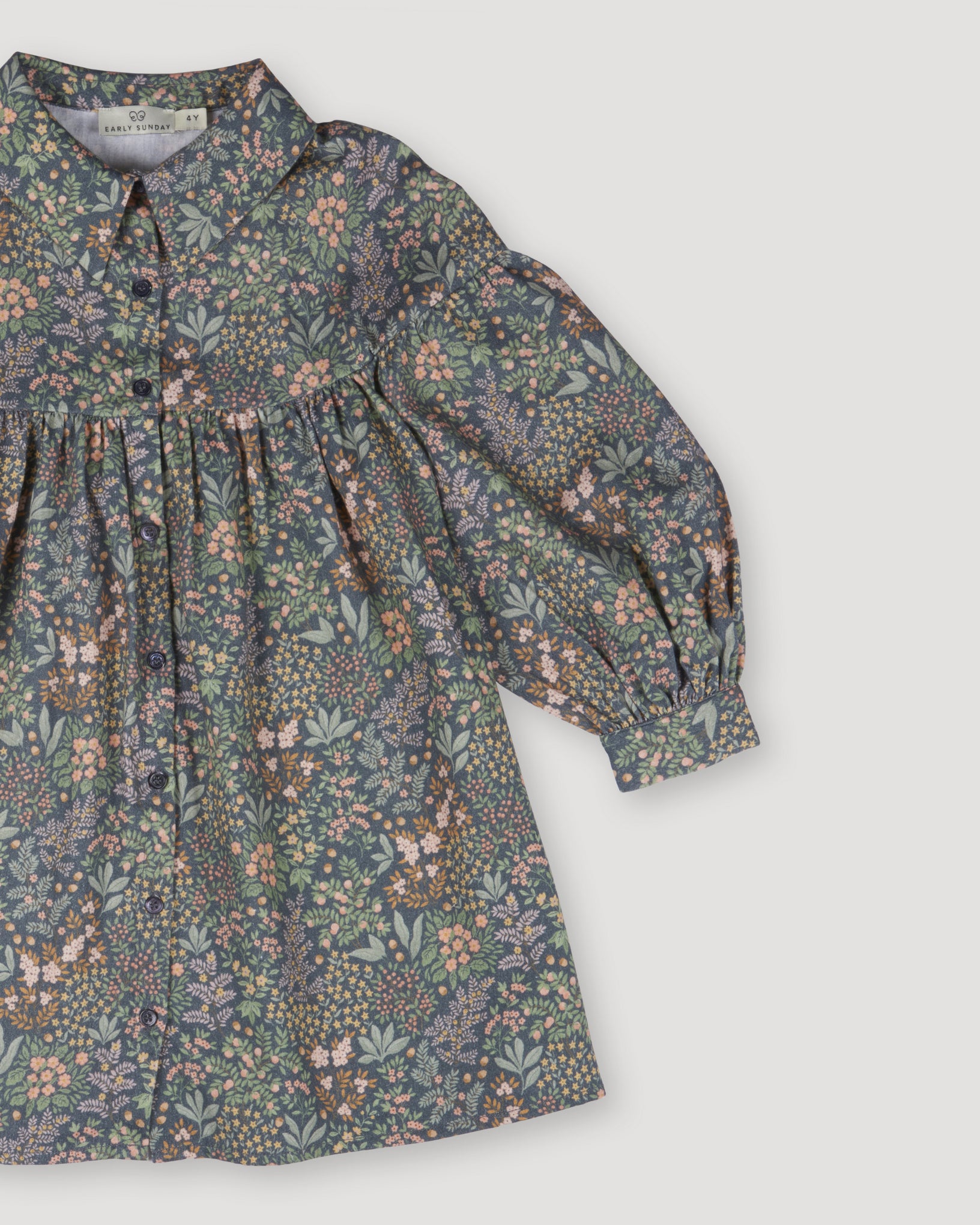 The Melanie Dress, crafted from printed cotton satin, features a sophisticated autumn garden print in a greyish blue shade. With a refined collar complementing its smooth, lustrous finish, this dress offers an elegant floral design that’s perfect for both special occasions and everyday wear.