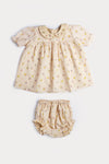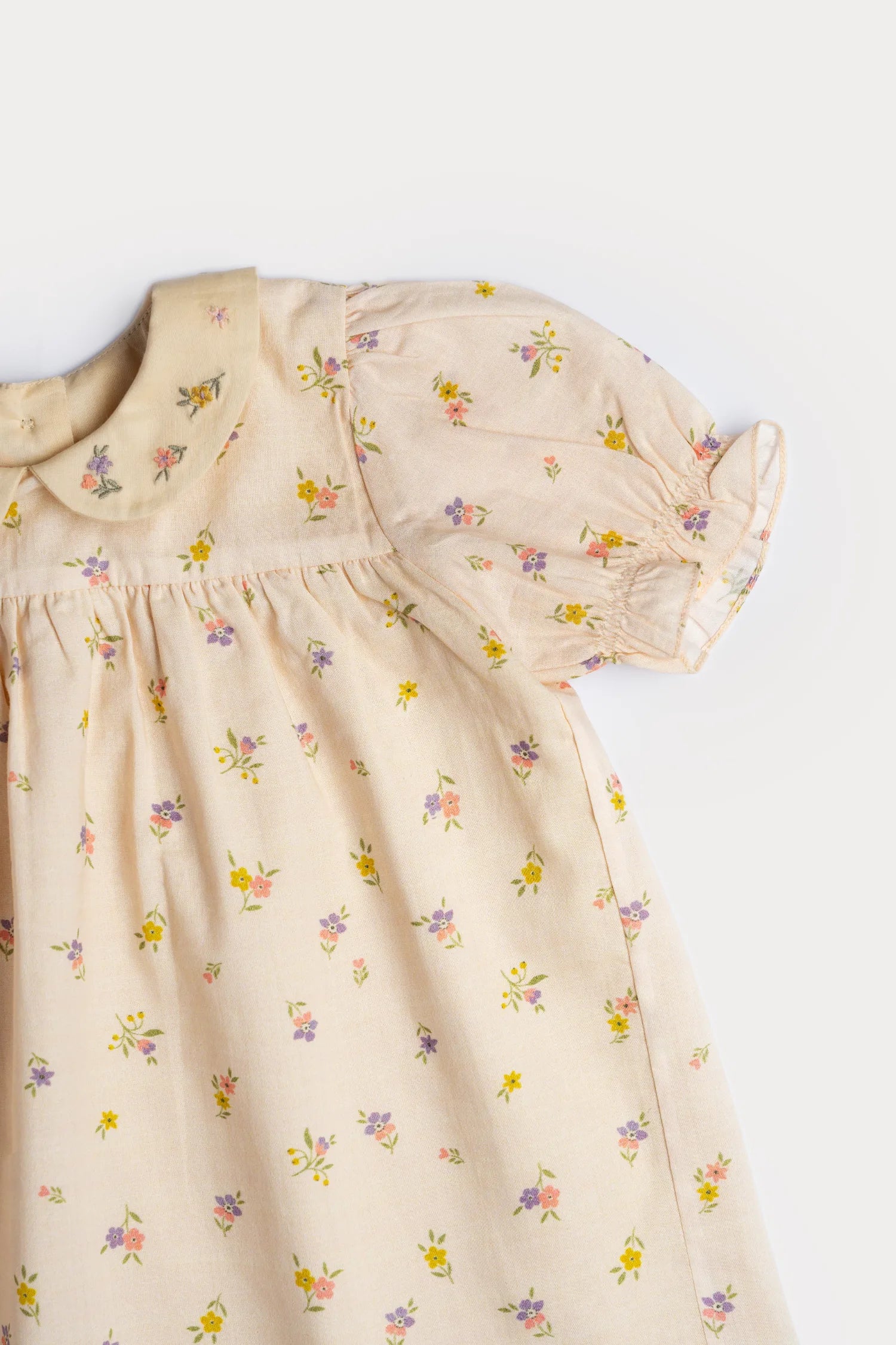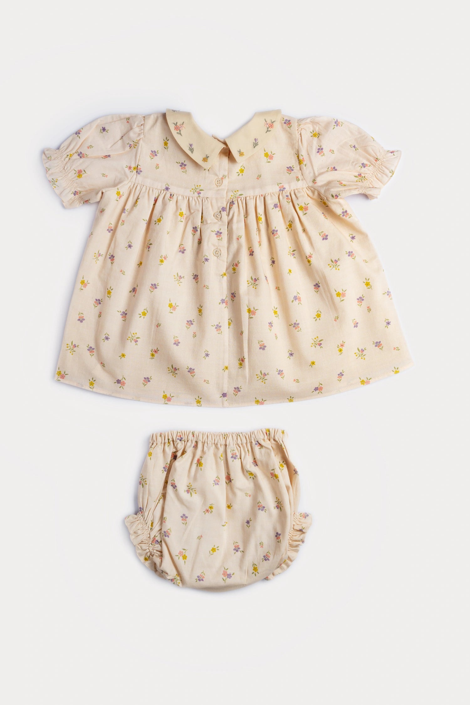 The Minnie Dress is a dream crafted from cotton cambric with our charming tiny flowers print. A peter pan collar adds a touch of sophistication, while the puffed sleeves create an adorable, timeless look. Paired with matching bloomers, this dress is perfect for any special occasion.