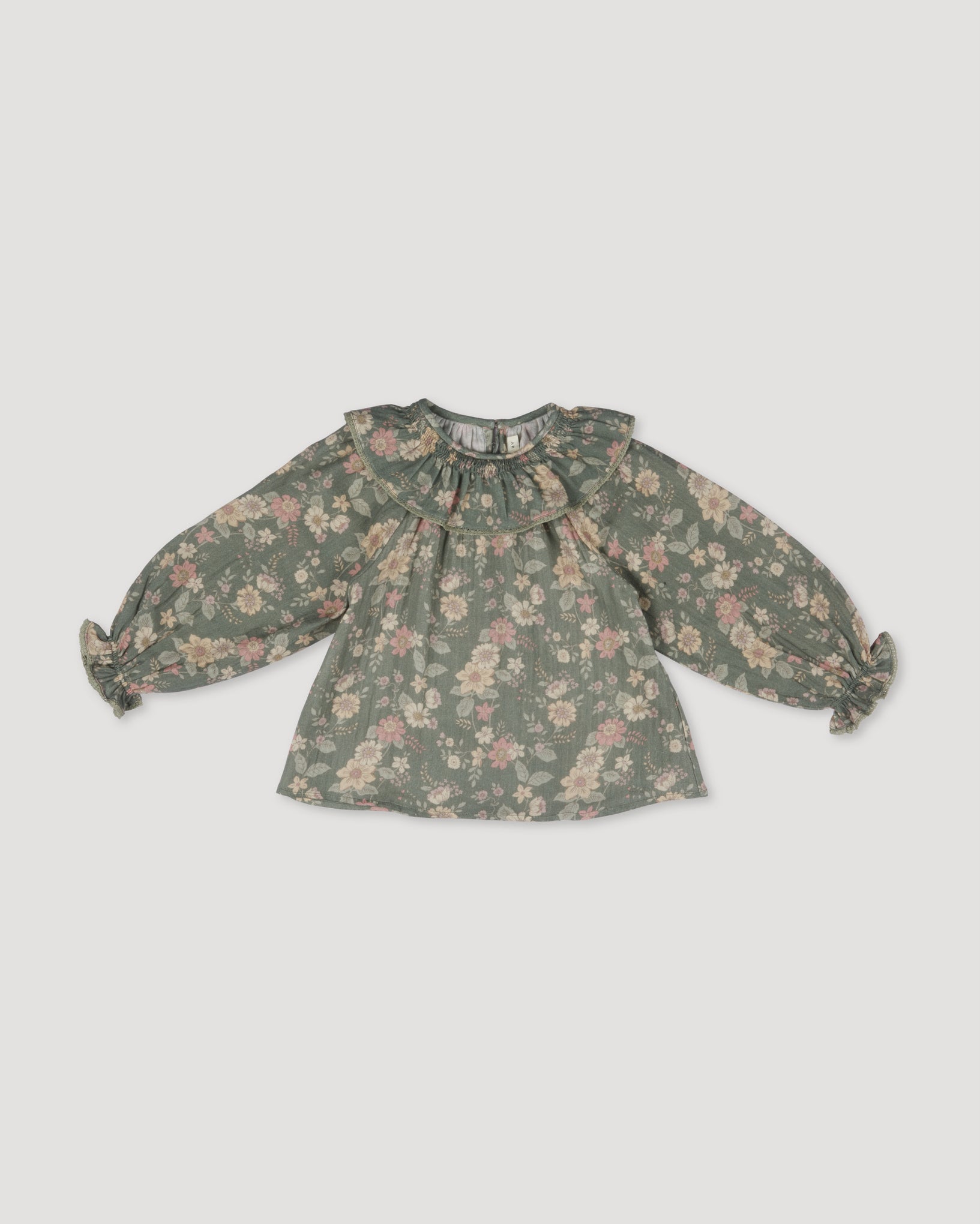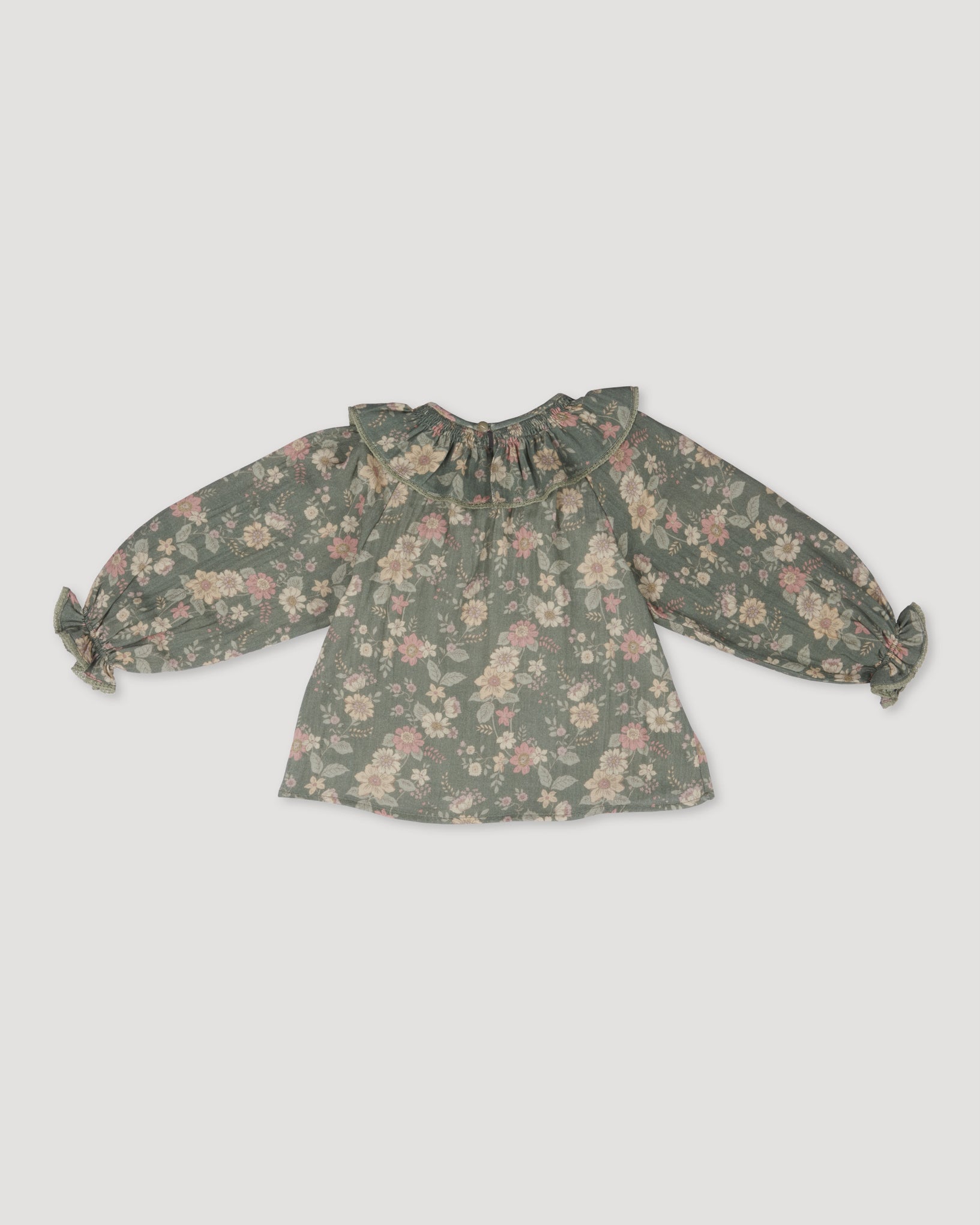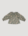The Paloma Blouse, made from printed cotton double gauze, features a gentle autumn bloom soft green shade with refined ruffle detailing around the neckline. This blouse blends a delicate print with breathable fabric, offering an elegant and charming touch for any occasion.