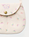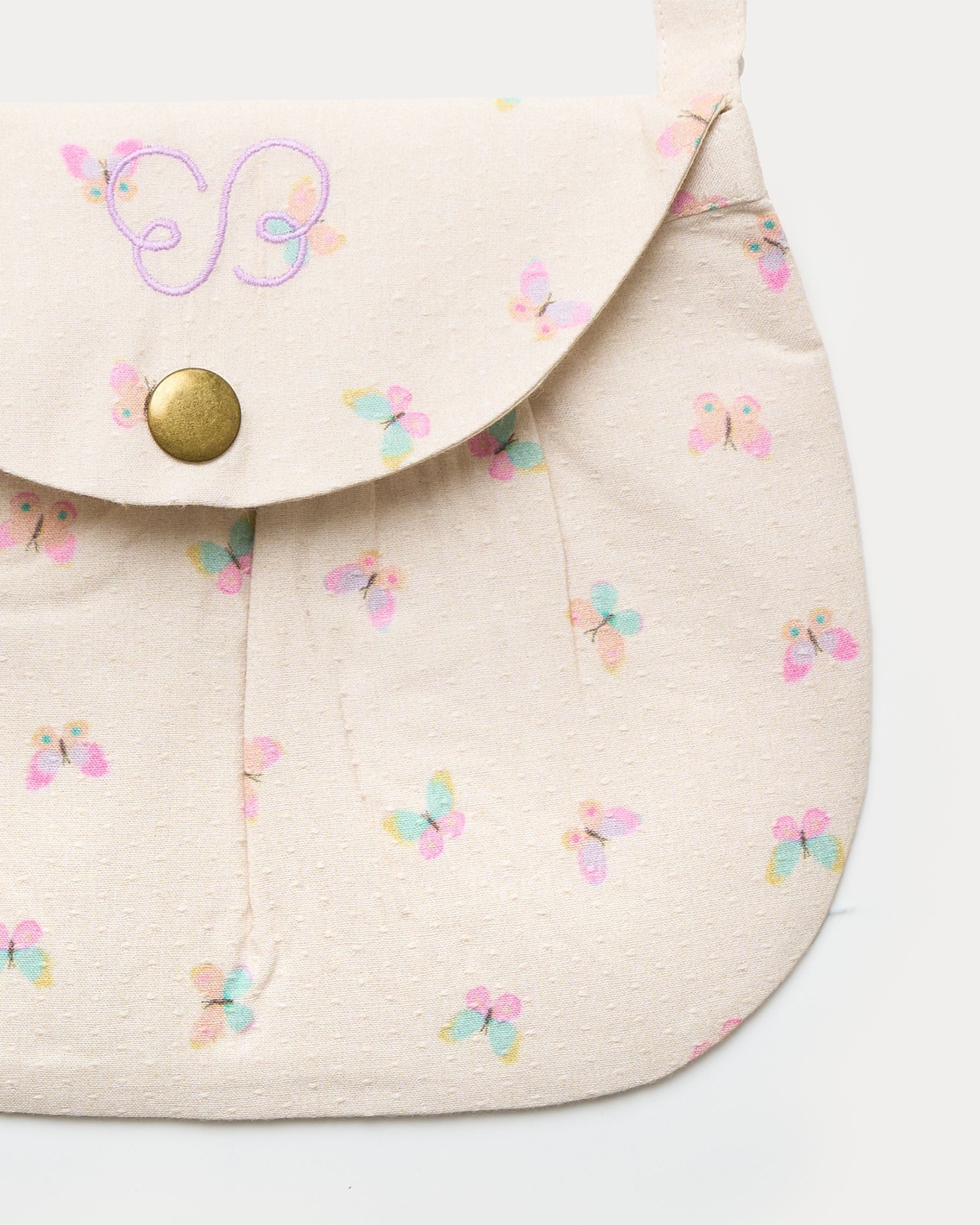 This cute sling purse is crafted from printed cotton tiny Swiss dobby and decorated with a playful butterfly print.