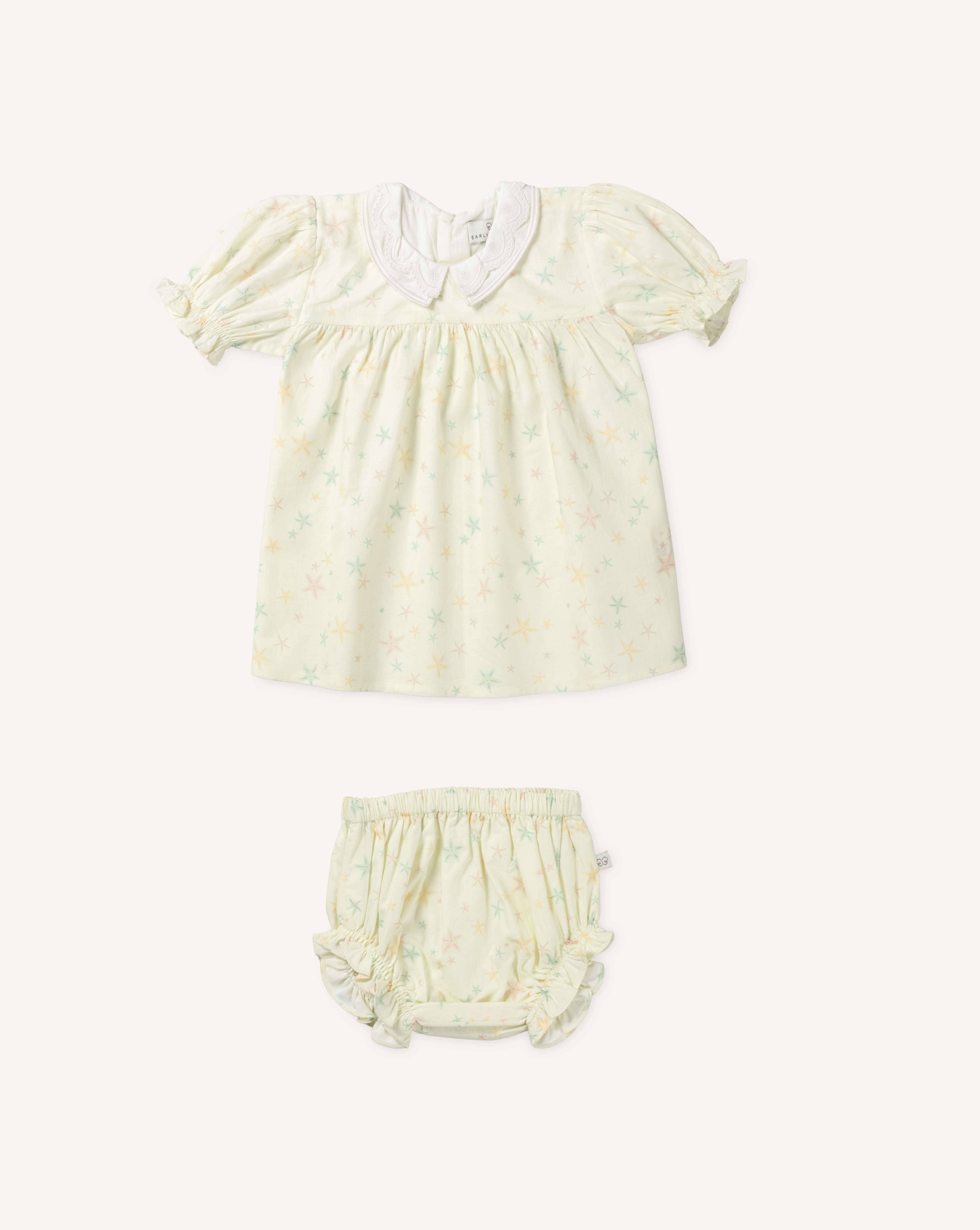 The Sukie Baby Dress & Bloomer Set is a charming and comfortable ensemble, crafted from a soft printed canvas blend of 70% cotton and 30% linen, featuring a delicate mini flowers print. Designed for both style and ease, this dress offers a relaxed fit with a flared skirt for effortless movement, while the matching bloomer ensures a snug and secure fit. Perfect for warm days, this set adds a fresh, feminine touch to your little one’s wardrobe.
