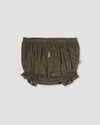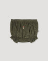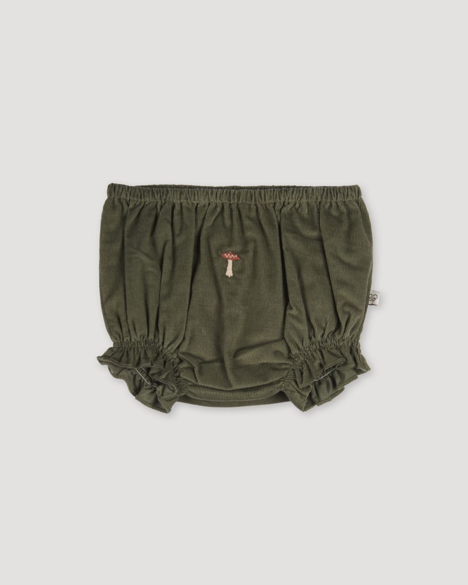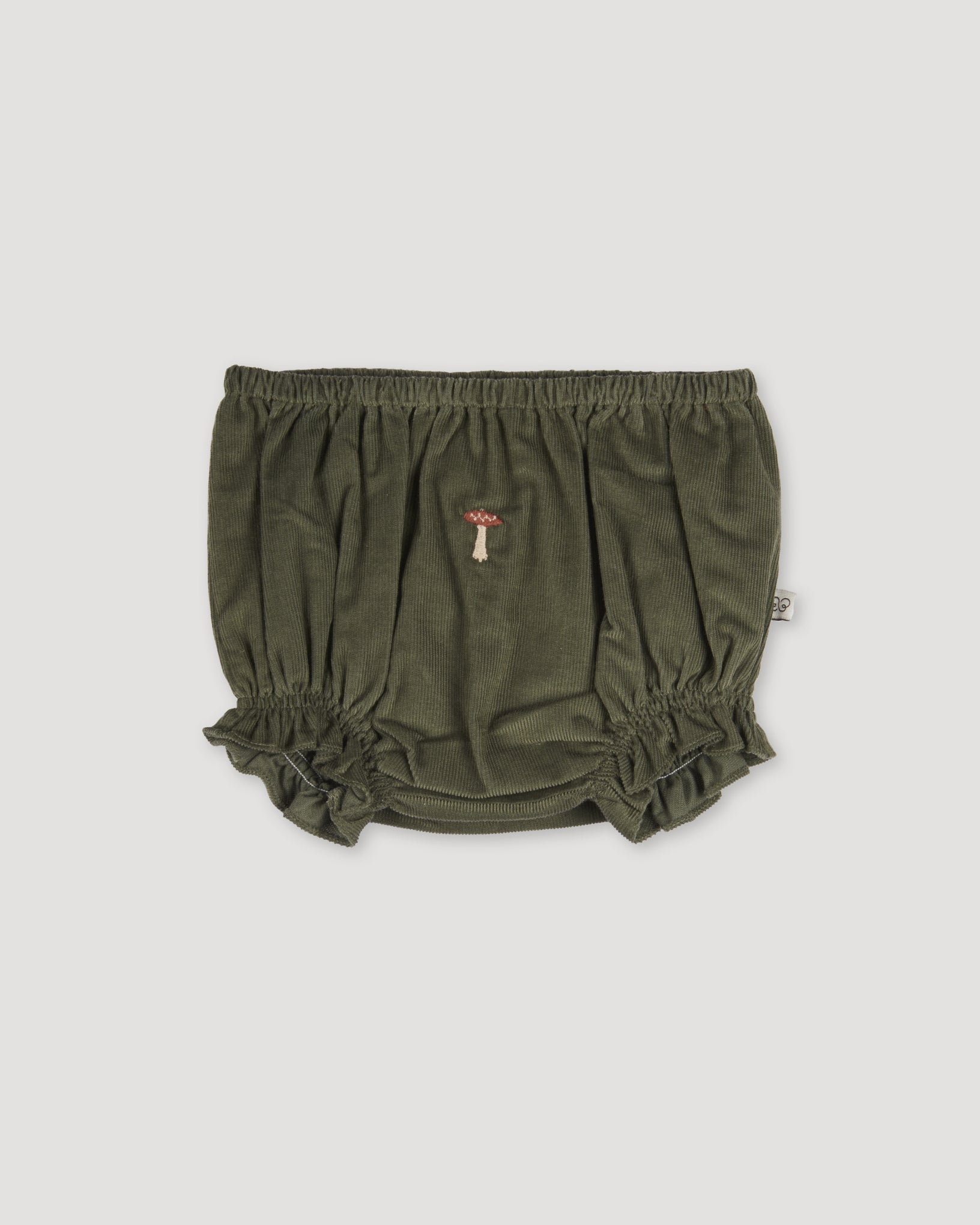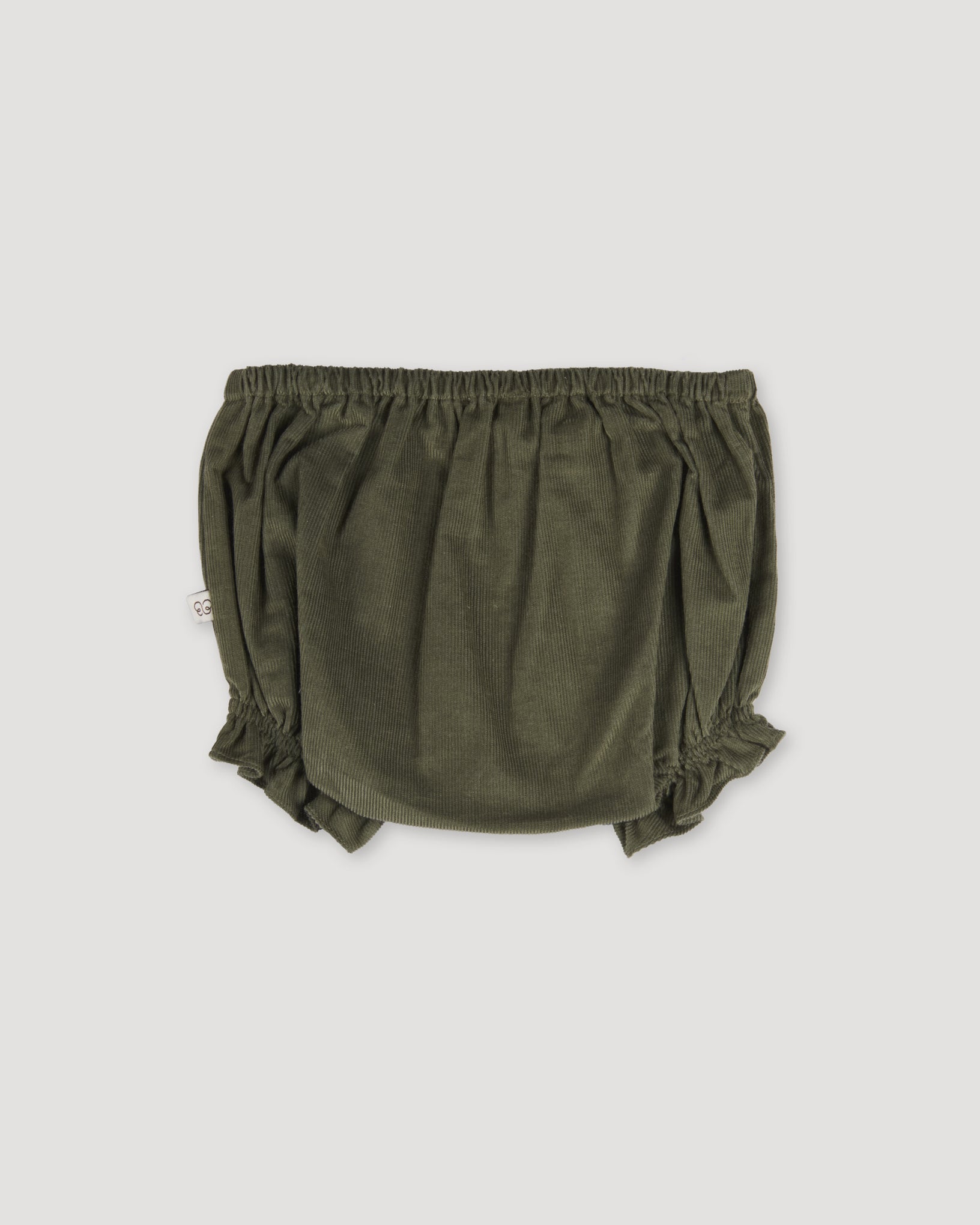 The Cherry Baby Bloomer, expertly crafted from soft moss cotton corduroy, offers both comfort and timeless style. With an elasticated waistband and leg openings for a snug fit, these versatile bloomers can be easily paired with any top, making them perfect for everyday wear or special occasions.