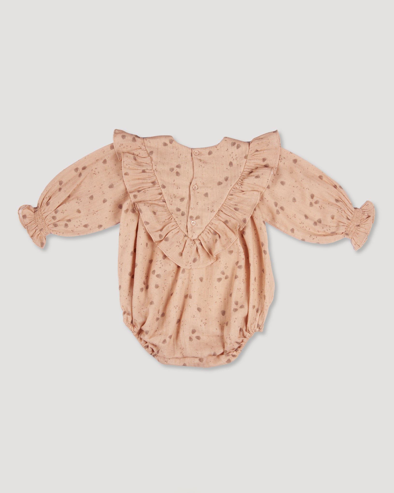 The Lola Baby Romper, crafted from soft printed cotton double gauze, features a charming acorn design in dusty pink. This lightweight and breathable romper is designed with your little one’s comfort in mind, perfect for everyday play or special outings. With gentle elastic at the leg openings and easy snap closures, it combines adorable style with practical wearability.