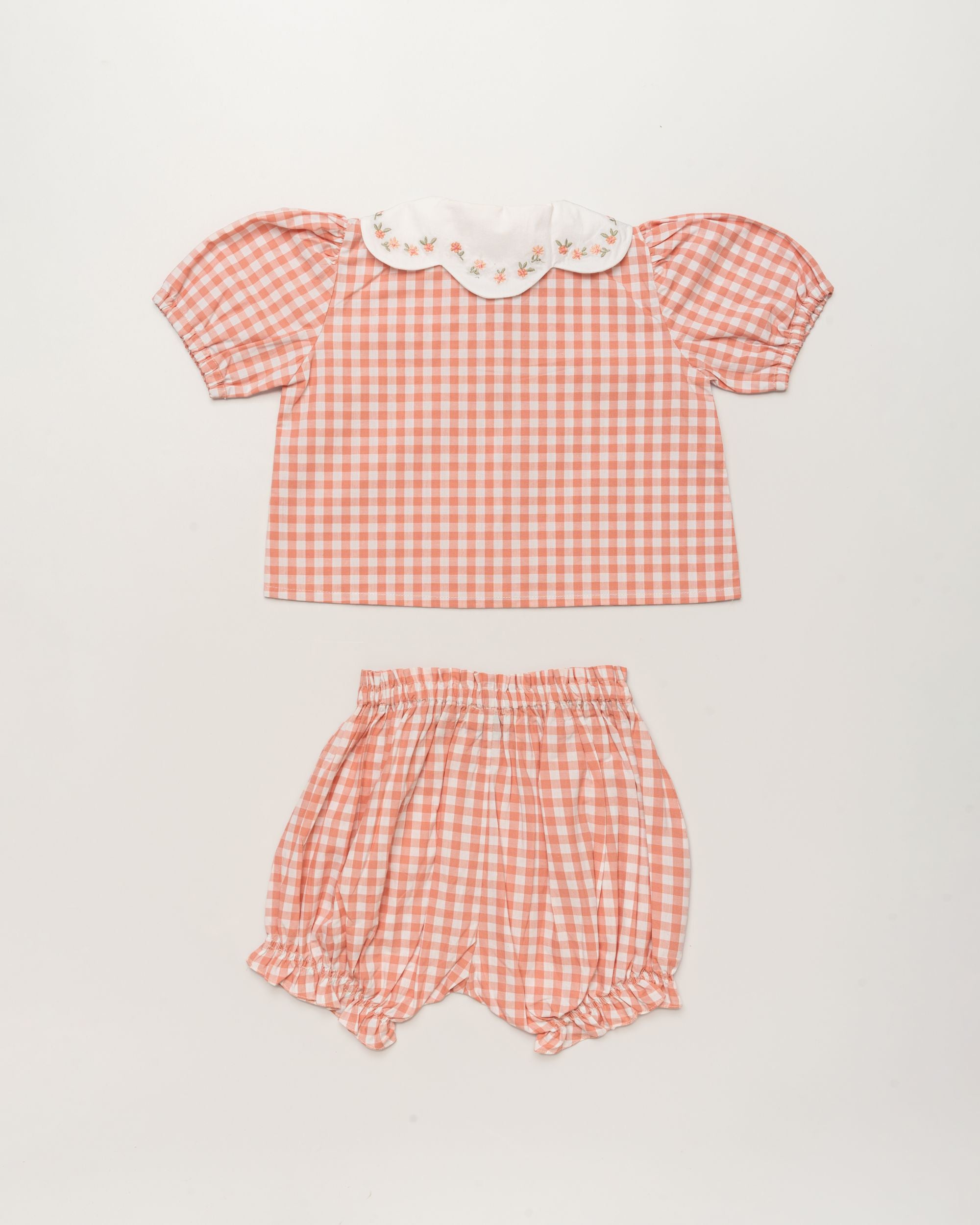 Tilly Blouse & Holly Baby Shorts is a cute and comfortable set for babies, crafted from soft 100% cotton gingham check fabric and featuring a charming Peony print. Perfect for keeping your little one stylish and playful all day.