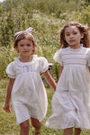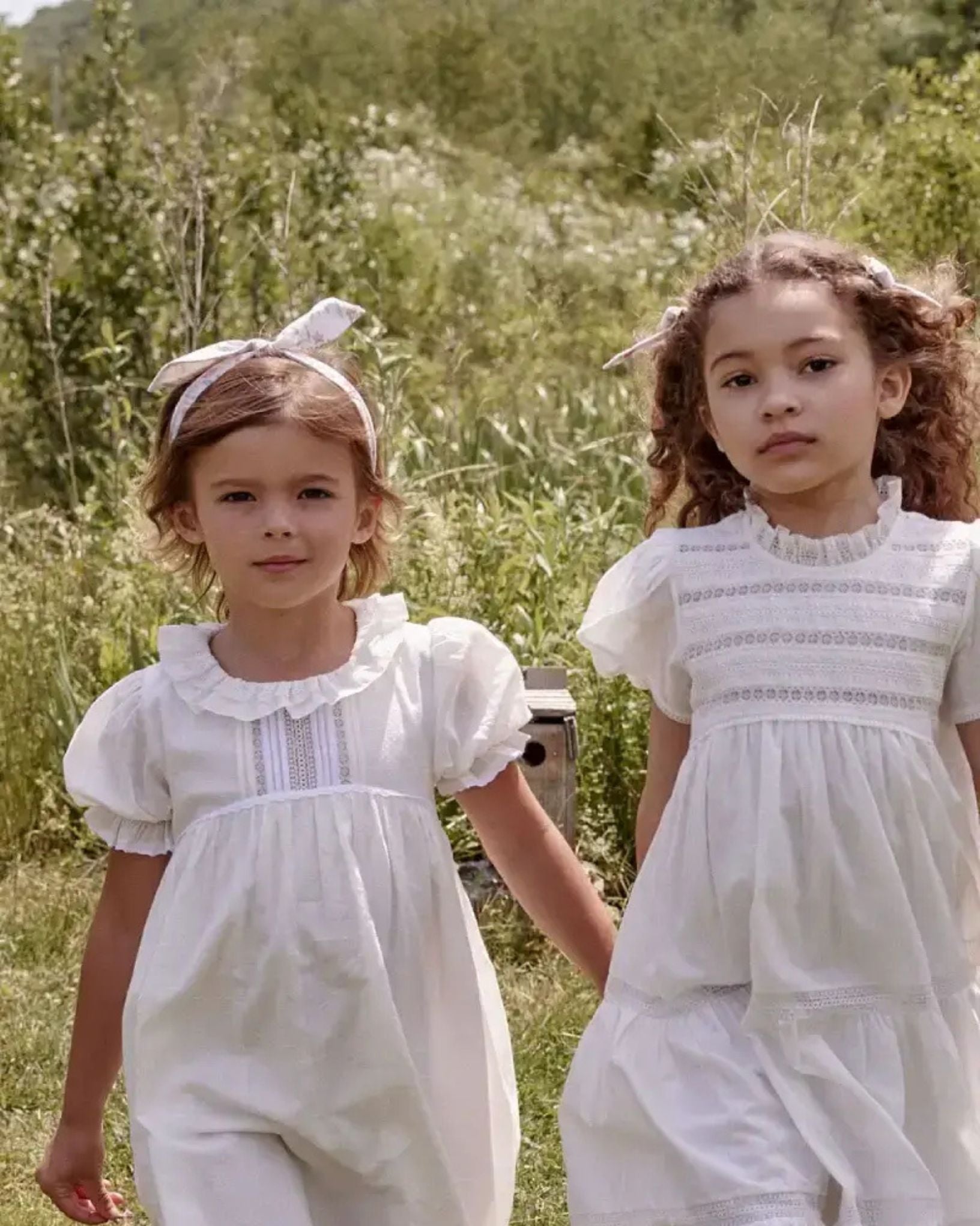 The Vanessa Dress embodies elegance in ivory, crafted from luxurious Swiss cotton dobby. As one of the most loved pieces of our Ivory Ceremonial Collection, it features puffed sleeves with a ruffle collar for added sophistication, while the flowy skirt ensures your little one shines brightest on special occasions.
